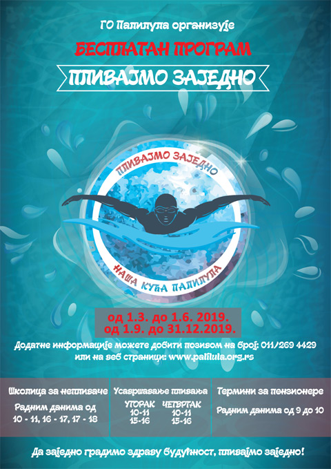 Gradska opština Palilula nastavlja sa programom "Plivajmo zajedno" na plivalištu "Tašmajdan" od 1. 3. do 1. 6. 2019. i od 1. 9. do 31. 12. 2019. godine.