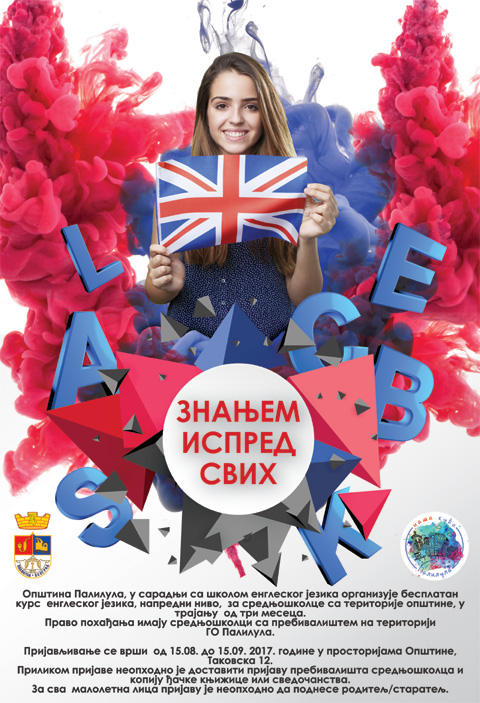 Opština Palilula, u saradnji sa školom engleskog jezika organizuje besplatan kurs engleskog jezika, napredni nivo, za srednjoškolce sa teritorije opštine, u trajanju od tri meseca.